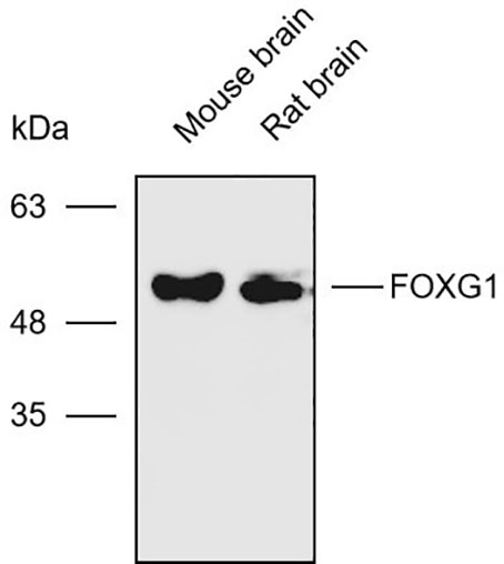 Western blot analysis with FOXG1 antibody diluted at 1:1000; Lane: Mouse brain,Rat brain