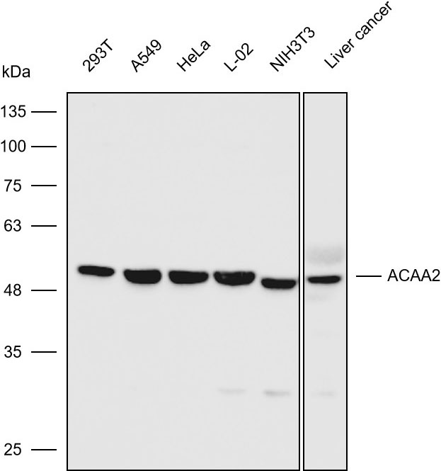Western blot analysis with ACAA2 antibody diluted at 1:500; Lane:293T,A549,Hela,L-02,NIH3T3,Human liver cancer