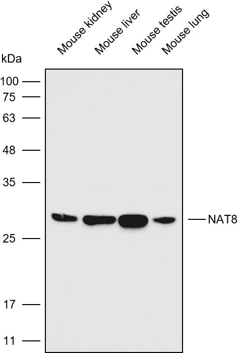 Western blot analysis with NAT8 antibody diluted at 1:500; Lane: Mouse kidney, Mouse liver,Mouse testis,Mouse lung