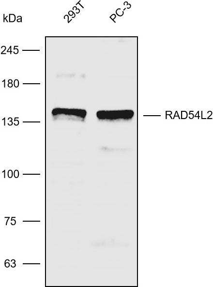 Western blot analysis with RAD54L2 antibody diluted at 1:500; Lane: 293T,PC-3