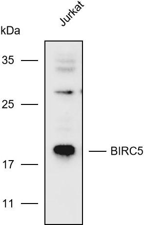 Western blot analysis with BIRC5 antibody diluted at 1:400; Lane 1-3:Jurkat