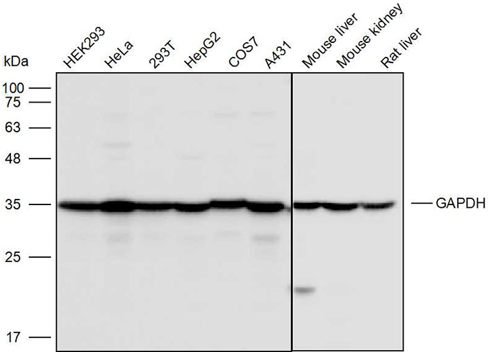 Western blot analysis with GAPDH antibody diluted at 1:8000;Lane:HEK293,HeLa,293T,HepG2,COS7,A431,Mouse liver,Mouse kidney,Rat liver