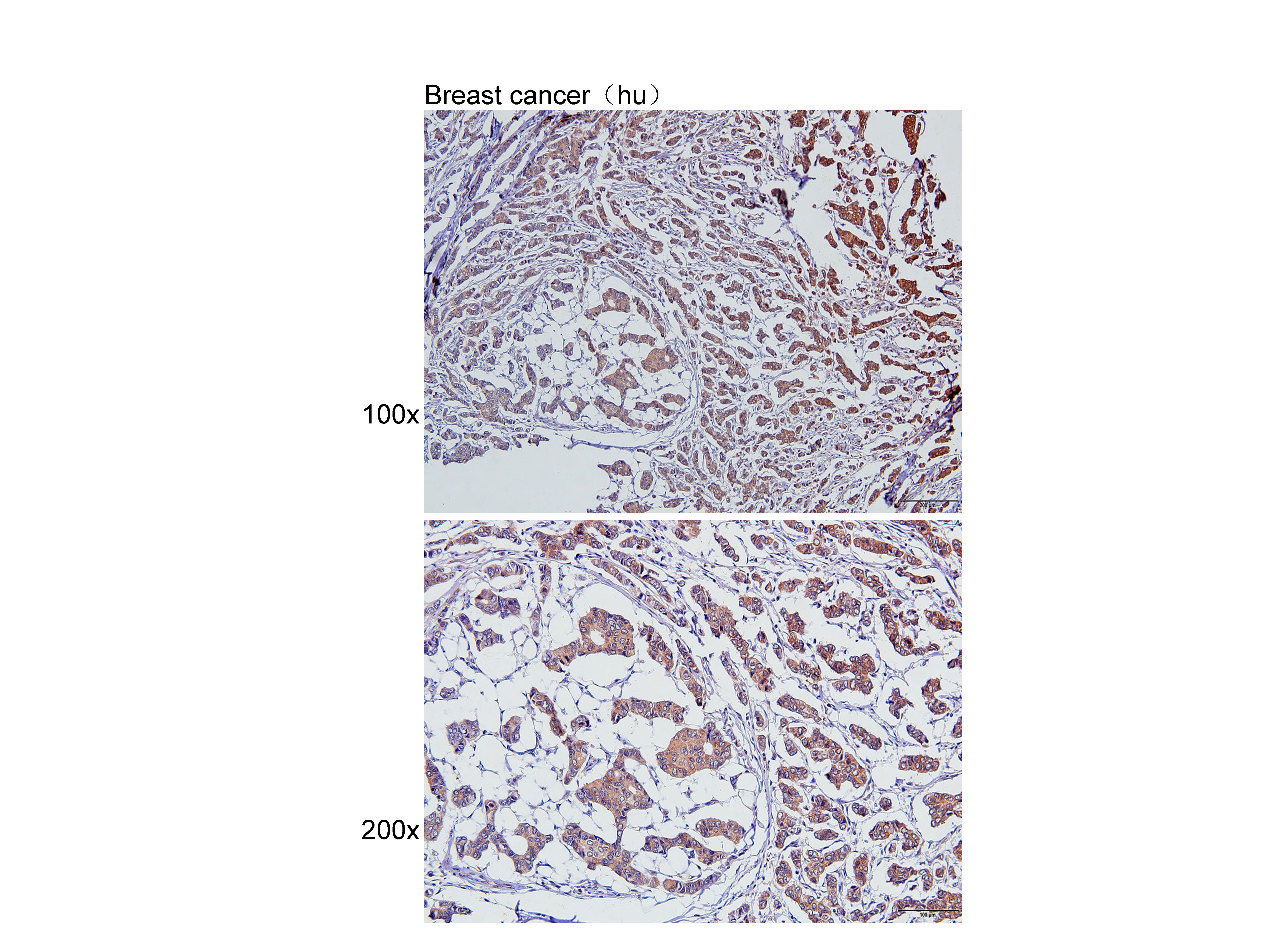 Immunohistochemistry of paraffin-embedded Breast cancer(hu) using GABA A Receptor alpha 1 at dilution of 1:50 (x100 lens,x200 lens).