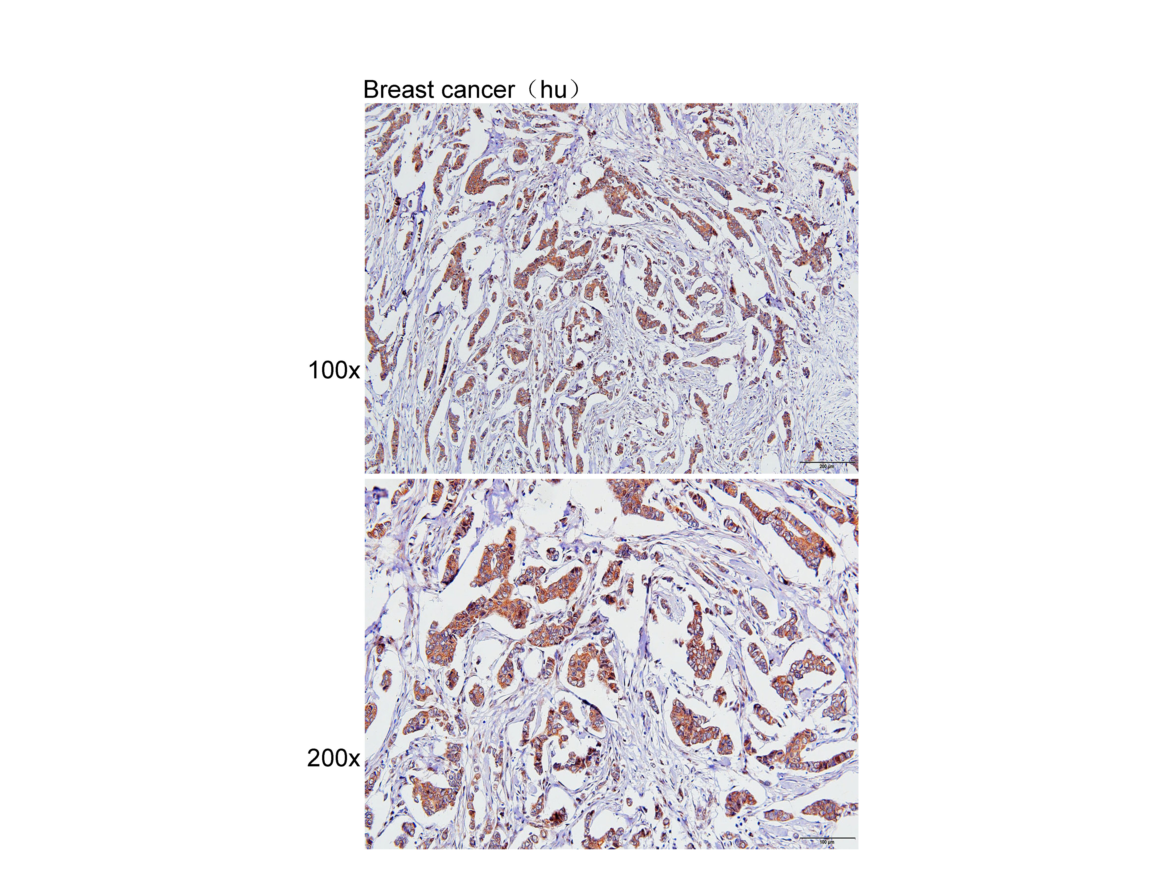 Immunohistochemistry of paraffin-embedded Breast cancer(hu) using IL-15 at dilution of 1:100 (x100 lens,x200 lens).