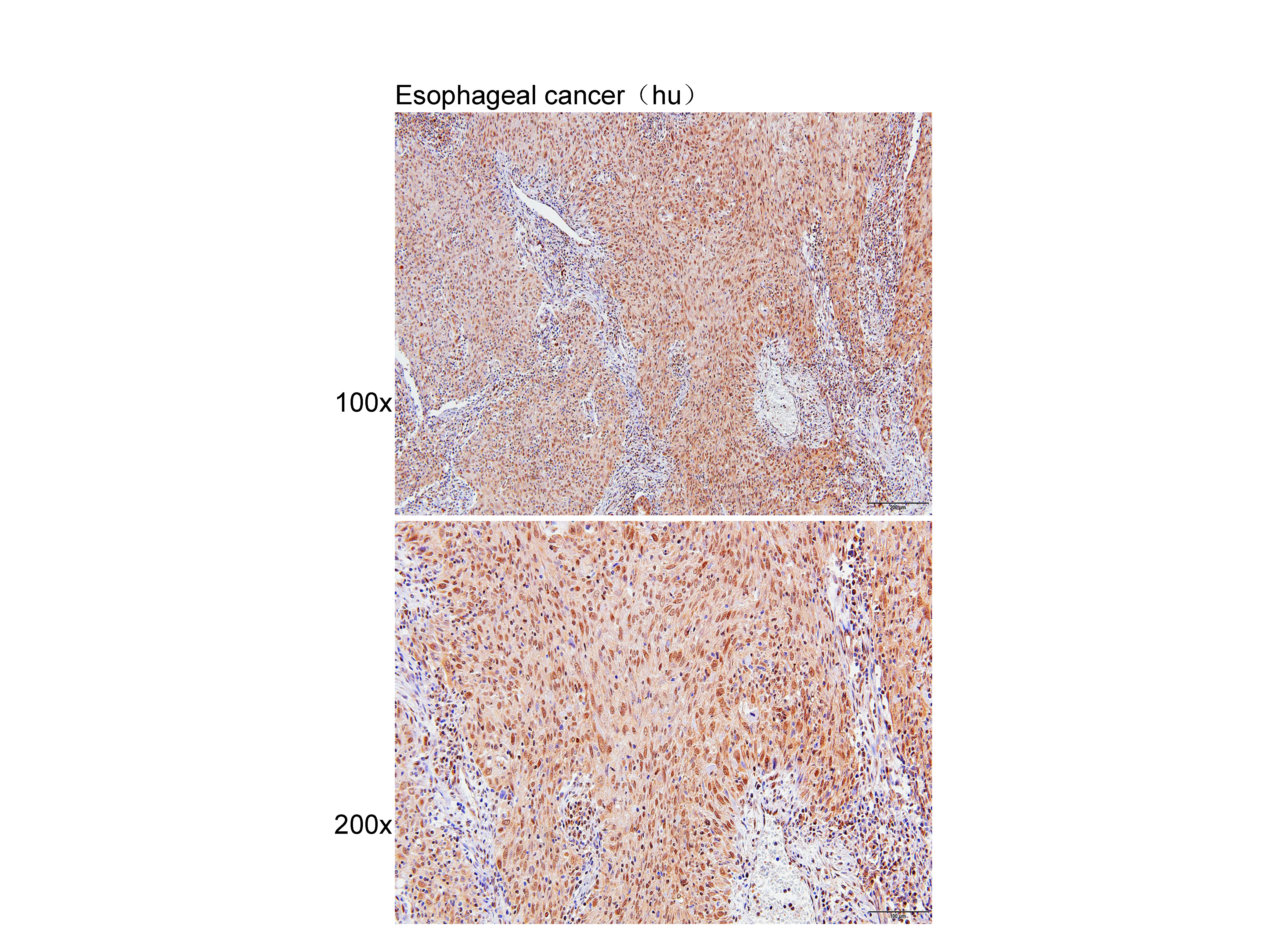 Immunohistochemistry of paraffin-embedded Esophageal cancer(hu) using IL-15 at dilution of 1:50 (x100 lens,x200 lens).