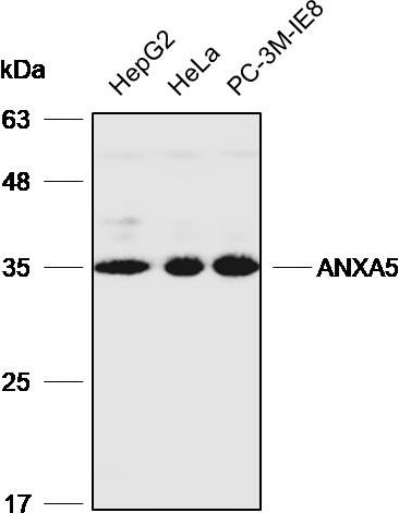 Western blot analysis with ANXA5 antibody diluted at 1:3000;Lane: HepG2,HeLa,PC-3M-IE8.