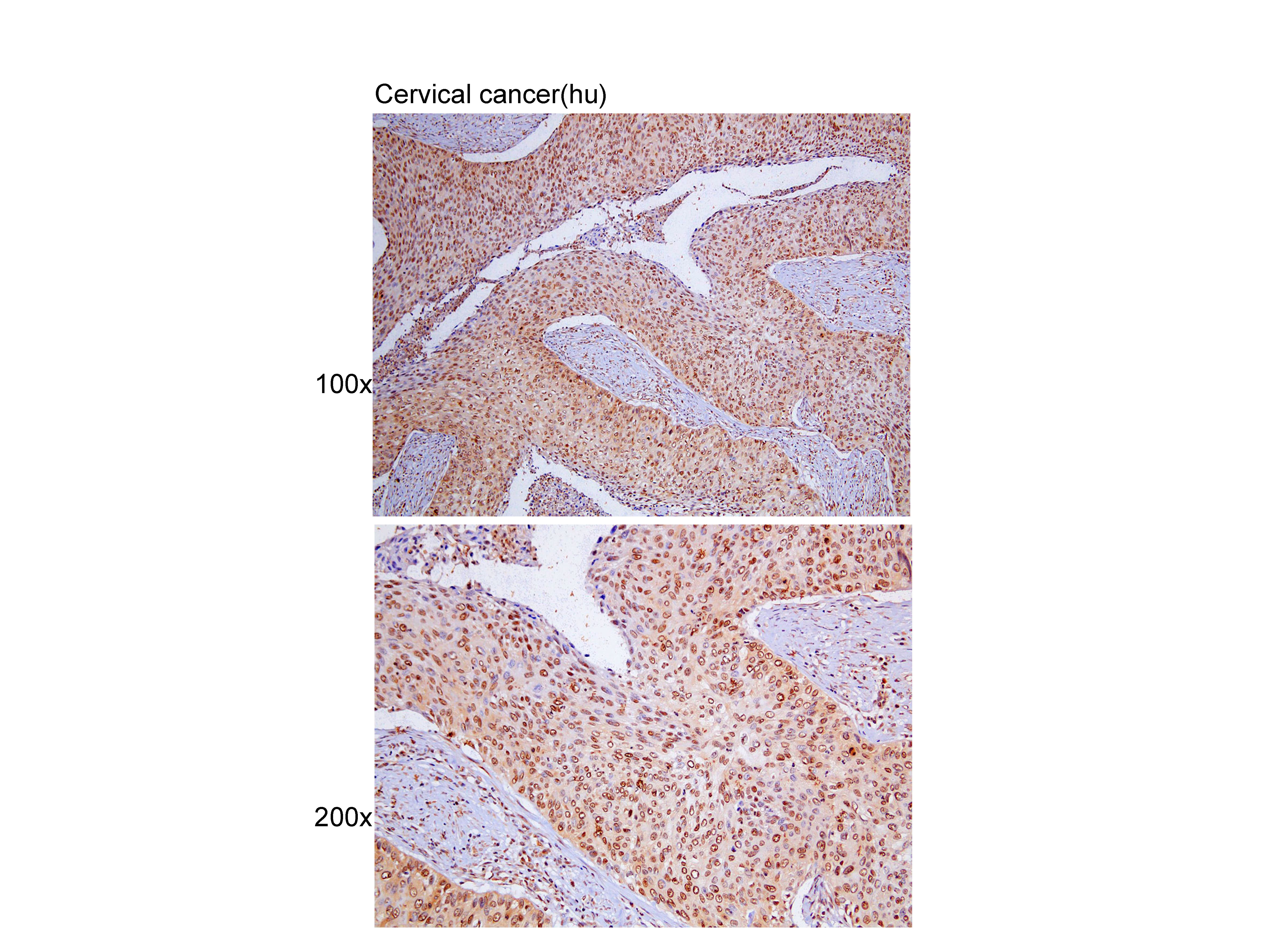 Immunohistochemistry of paraffin-embedded Cervical cancer(hu) using Cytokeratin8 at dilution of 1:100 (x100 lens,x200 lens).