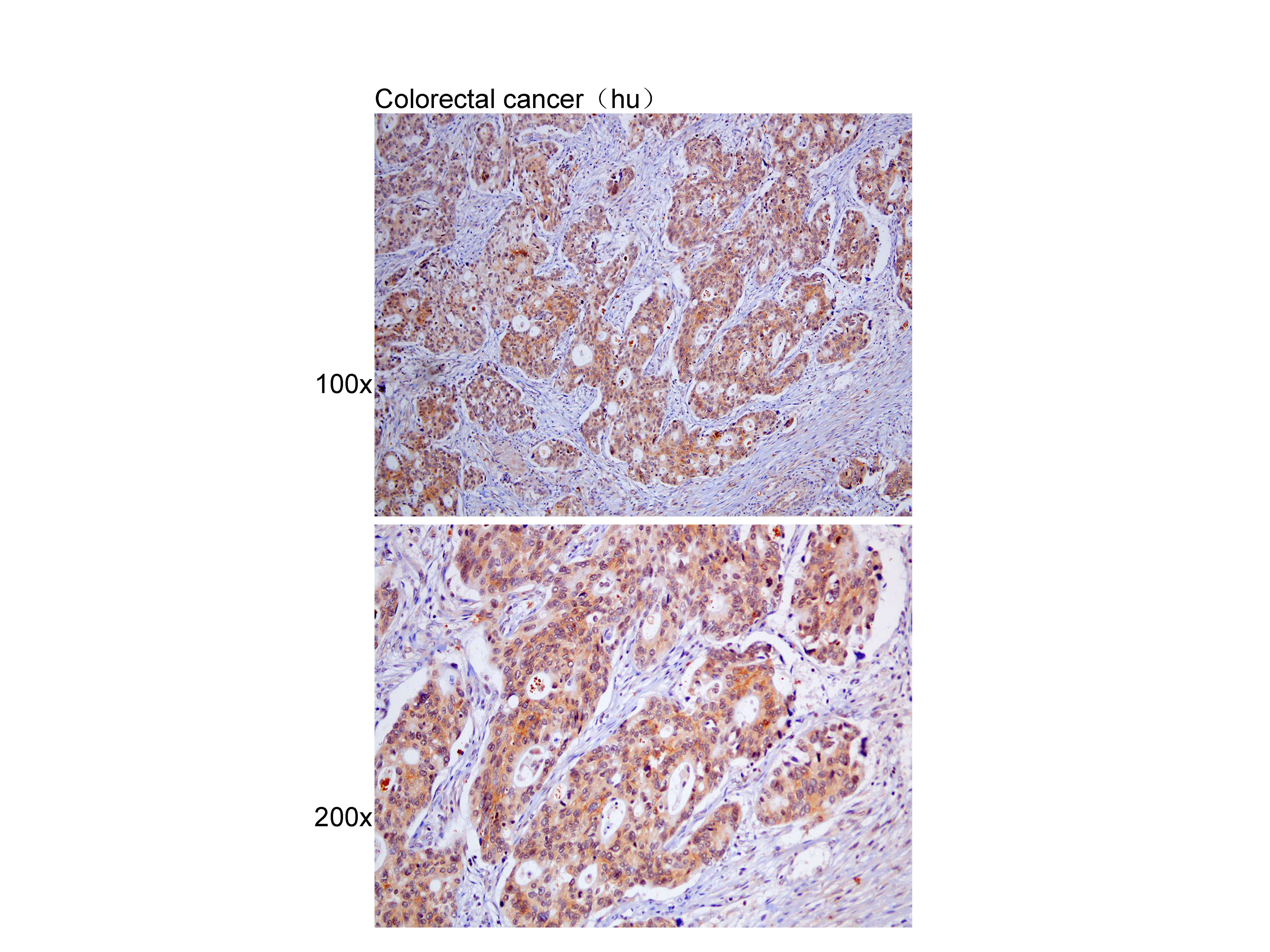 Immunohistochemistry of paraffin-embedded Colorectal cancer(hu) using APG4B at dilution of 1:100 (x100 lens,x200 lens).