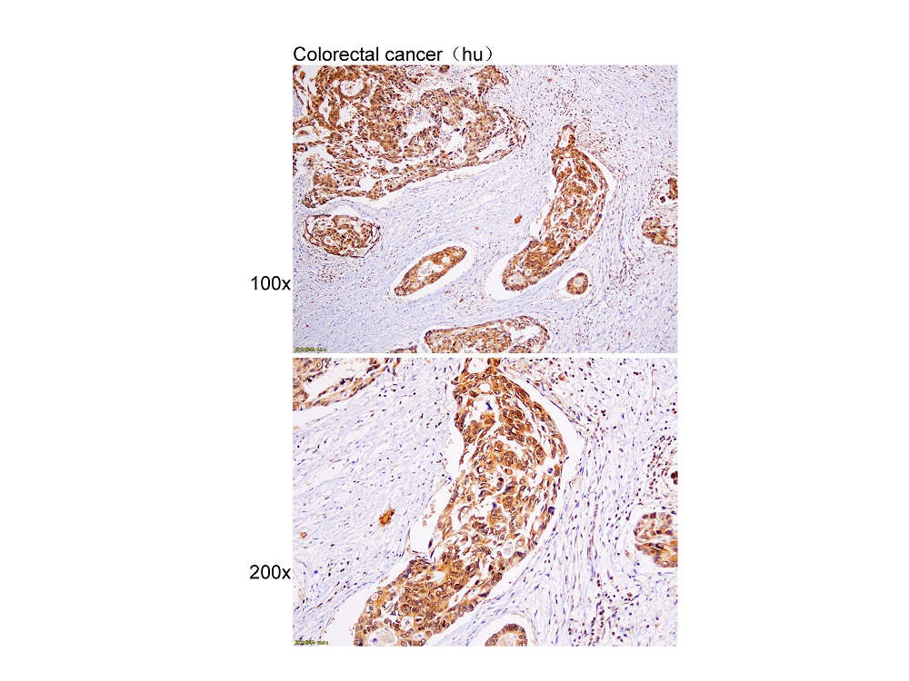 Immunohistochemistry of paraffin-embedded Human colorectal cancer with GRP78 antibody diluted at 1:100.
