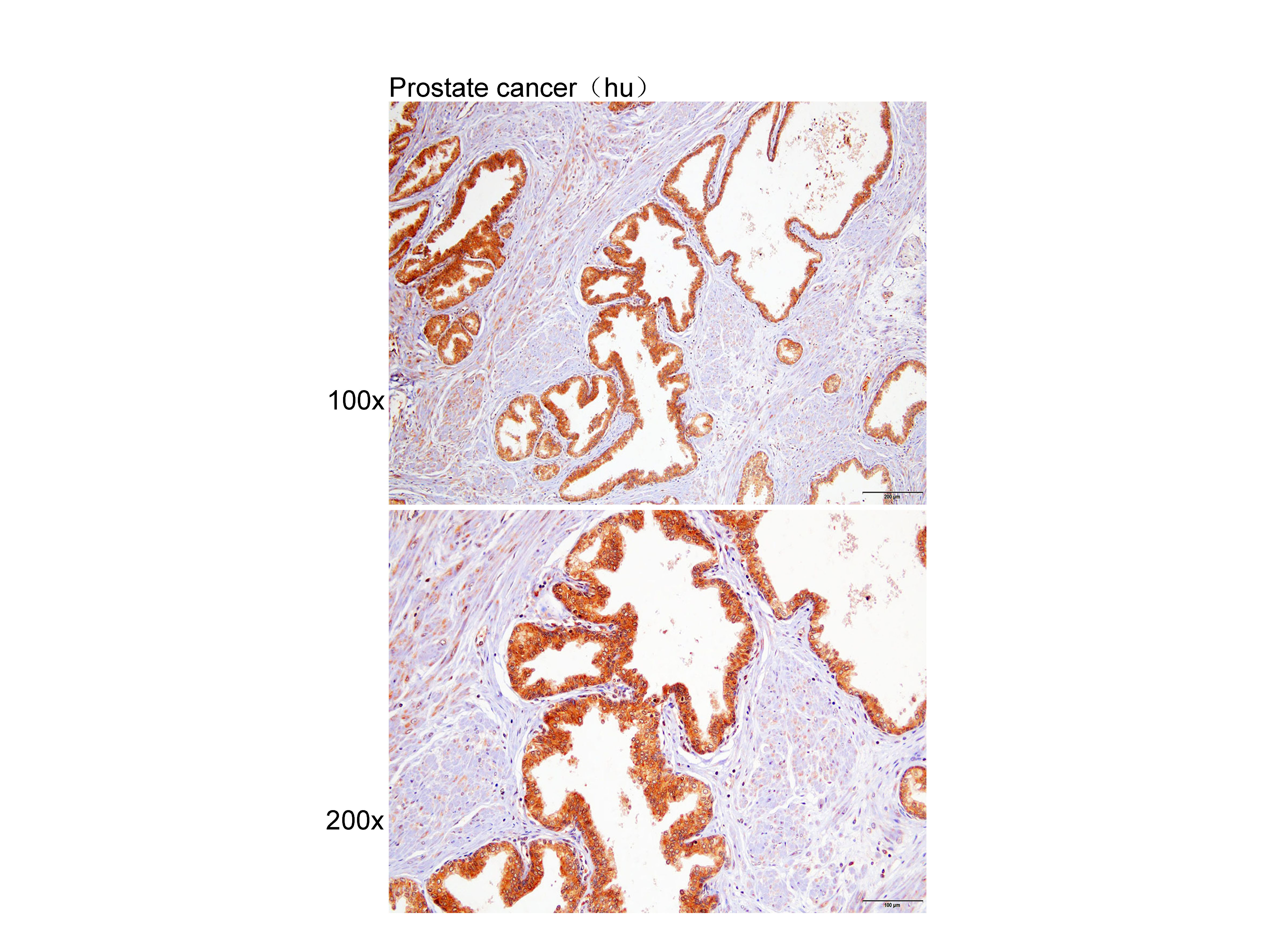 Immunohistochemistry of paraffin-embedded Prostate cancer(hu) using LTF at dilution of 1:100 (x100 lens,x200 lens).