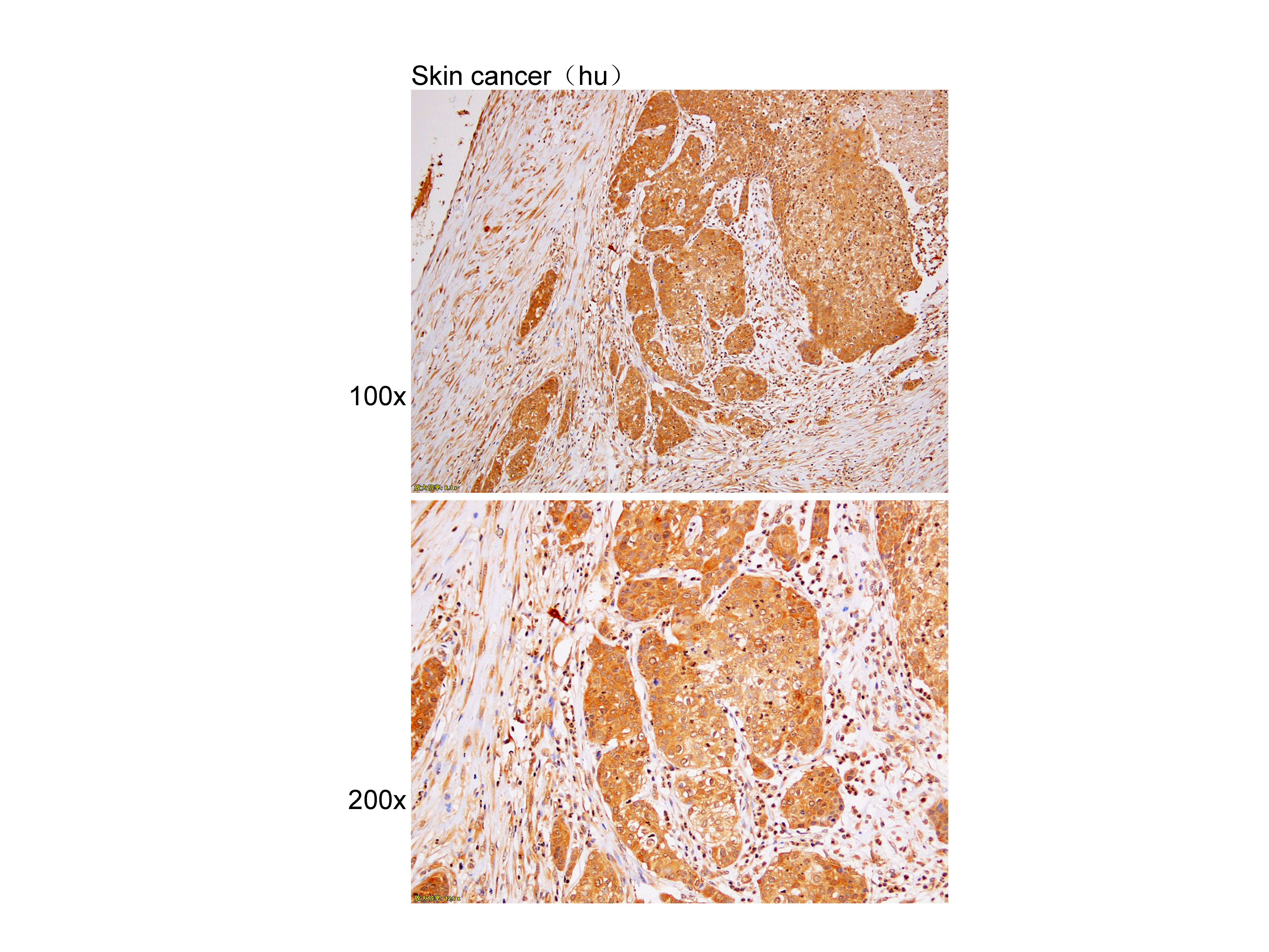 Immunohistochemistry of paraffin-embedded Skin cancer(hu) using CO2A1 at dilution of 1:100 (x100 lens,x200 lens).
