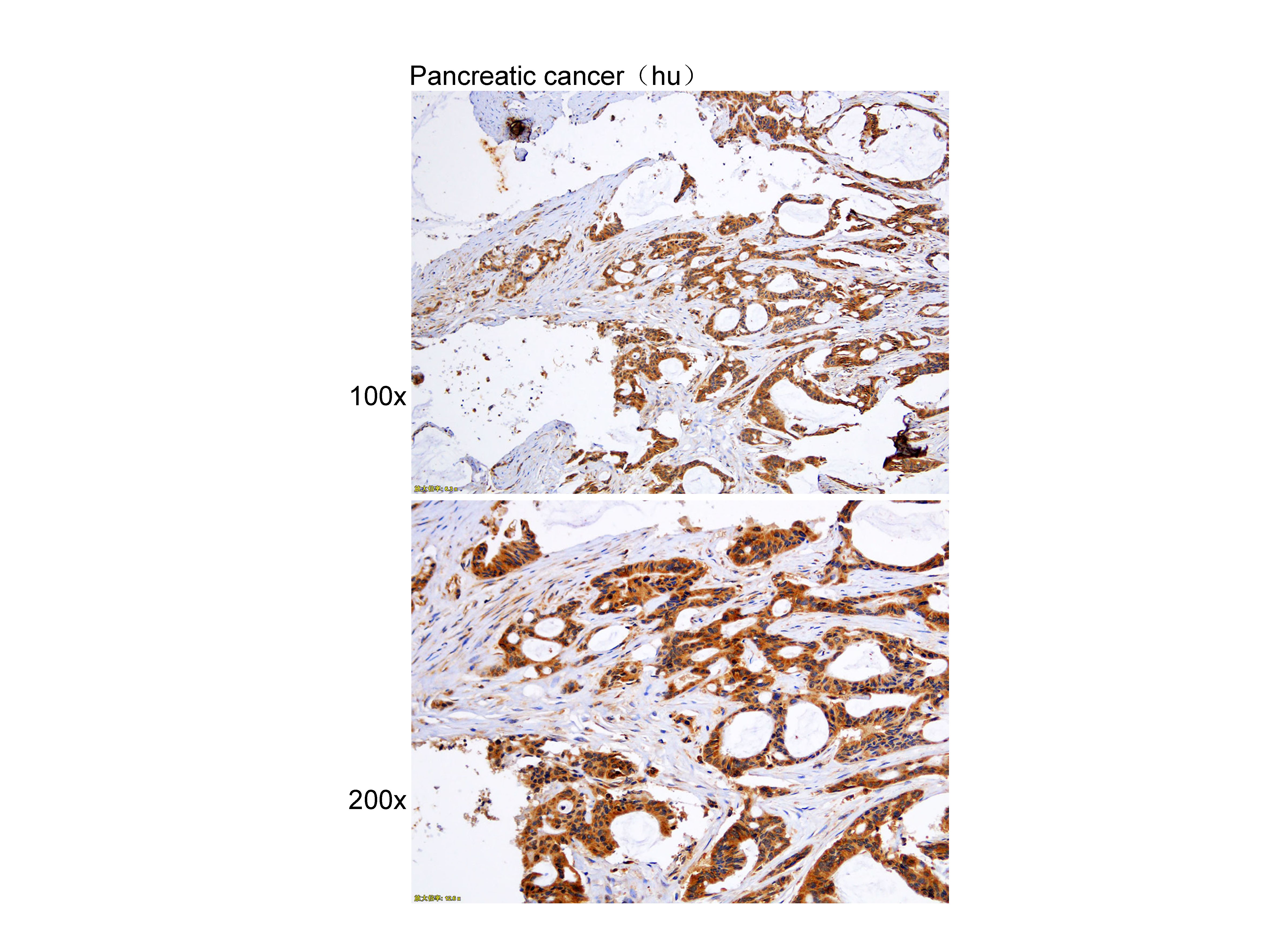 Immunohistochemistry of paraffin-embedded Pancreatic cancer(hu) using CaMK2 alpha at dilution of 1:100 (x100 lens,x200 lens).