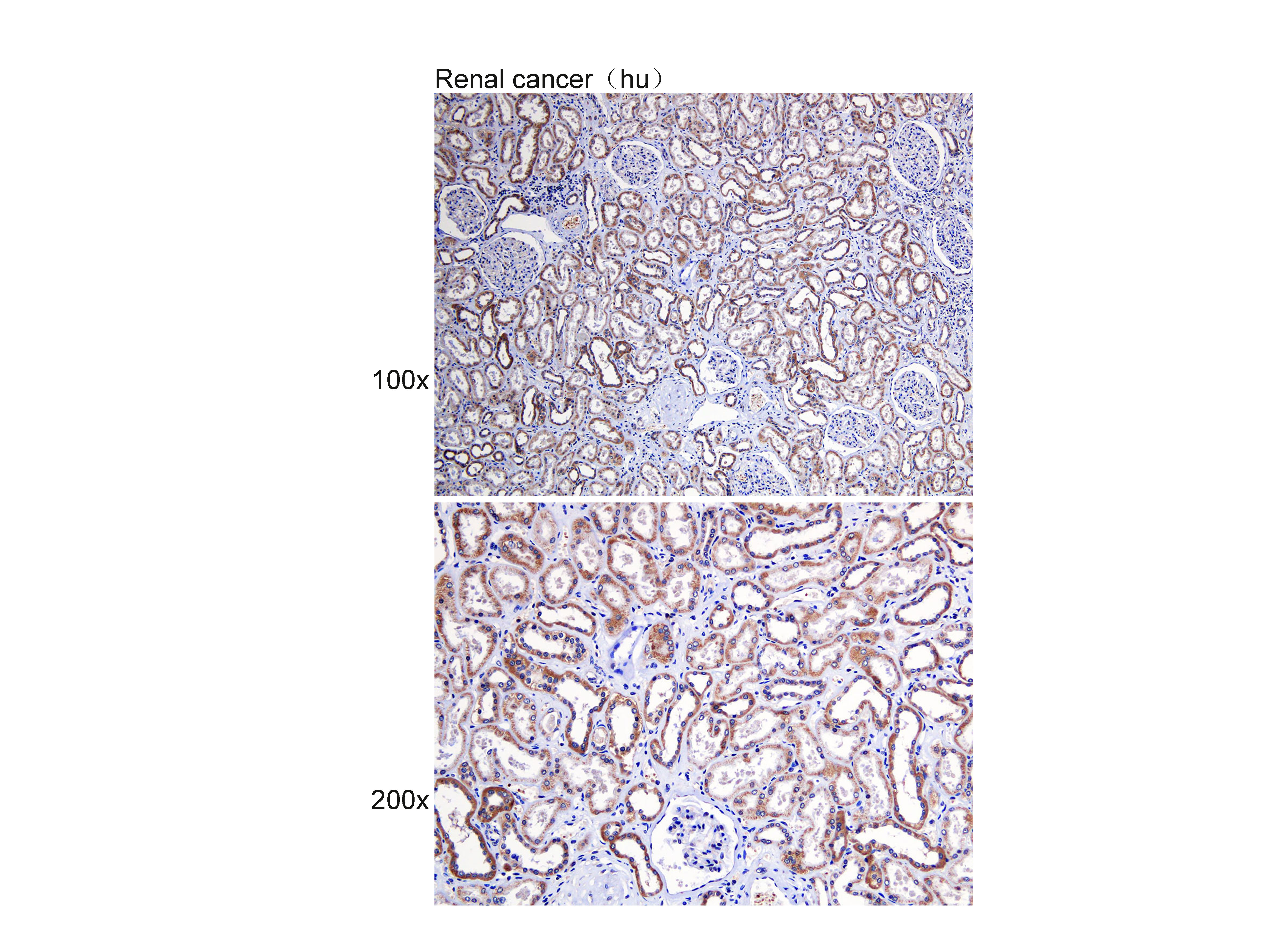 Immunohistochemistry of paraffin-embedded Renal cancer(hu) using Klotho at dilution of 1:50 (x100 lens,x200 lens).