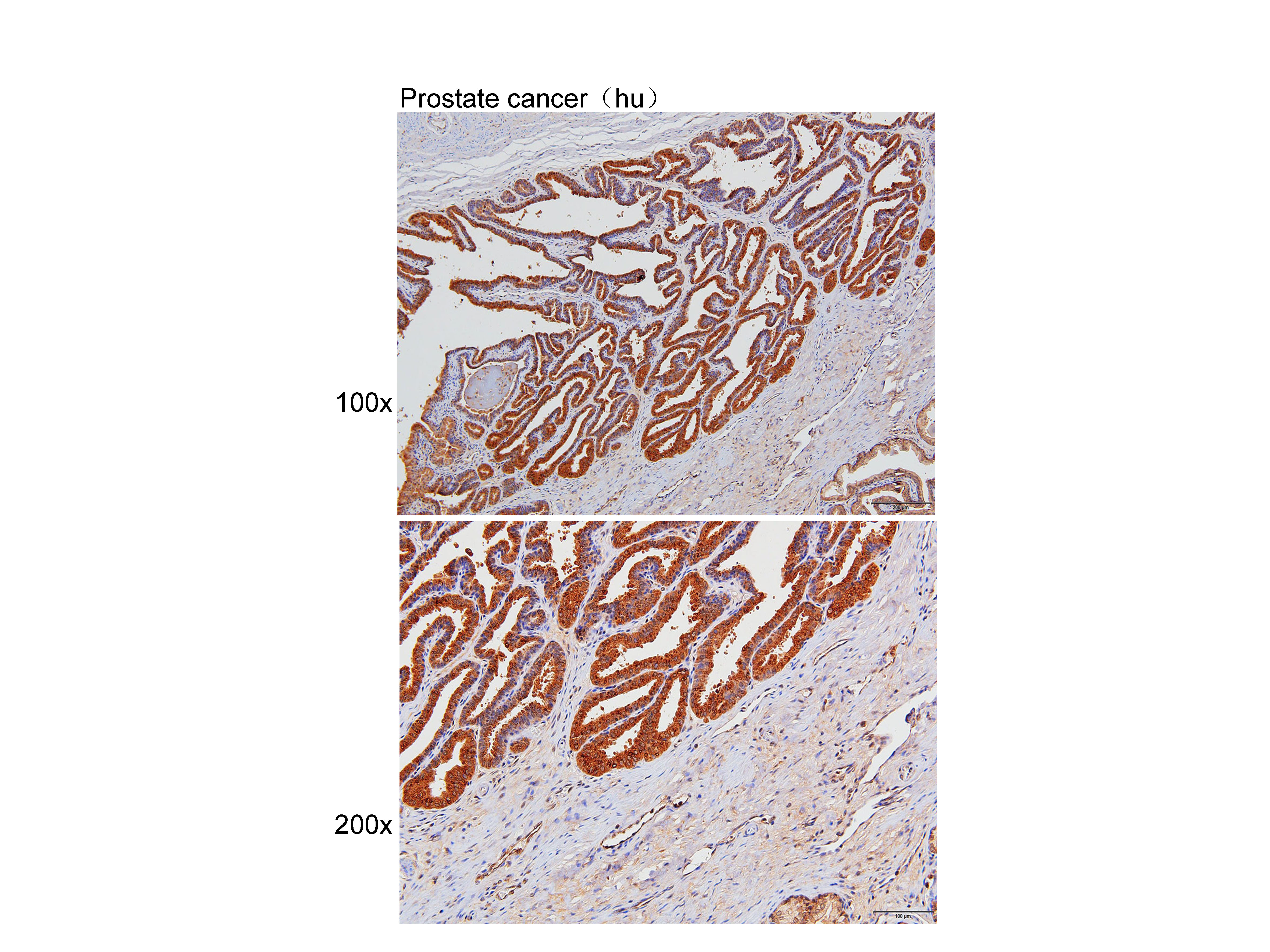 Immunohistochemistry of paraffin-embedded Prostate cancer(hu) using Klotho at dilution of 1:50 (x100 lens,x200 lens).