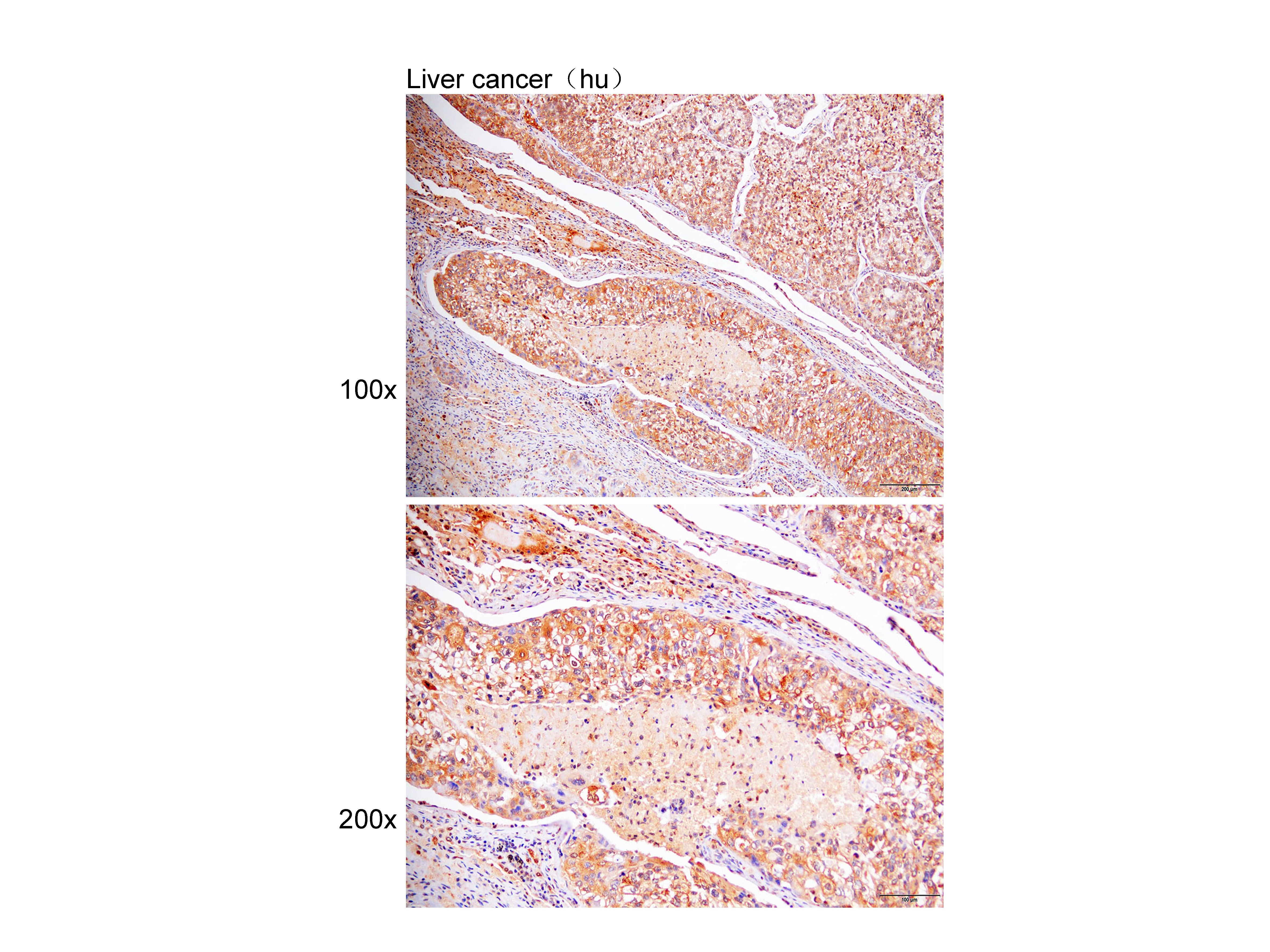 Immunohistochemistry of paraffin-embedded Liver cancer(hu) using CAT at dilution of 1:25 (x100 lens,x200 lens).