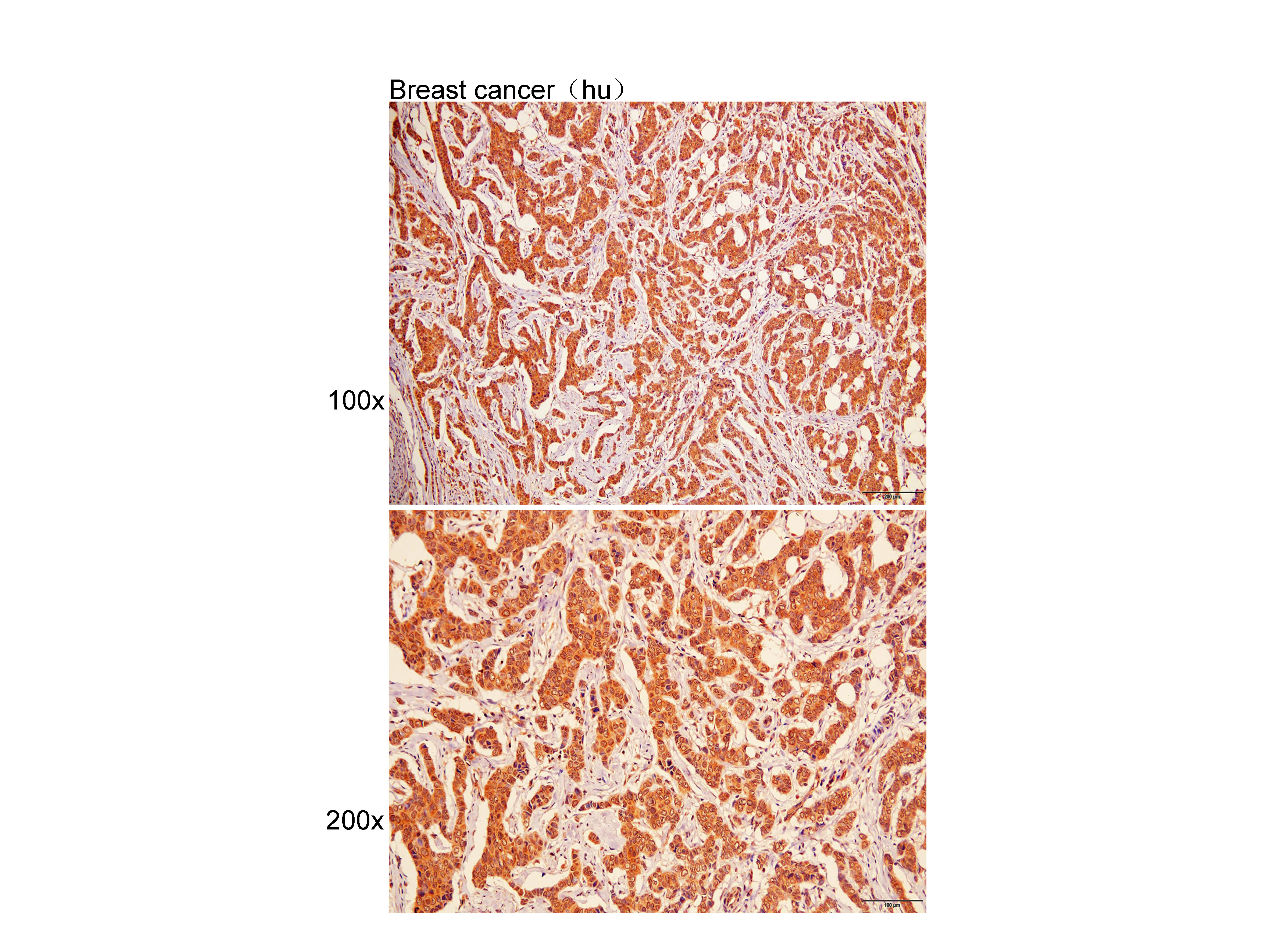 Immunohistochemistry of paraffin-embedded Breast cancer(hu) using IRAK4 at dilution of 1:50 (x100 lens,x200 lens).