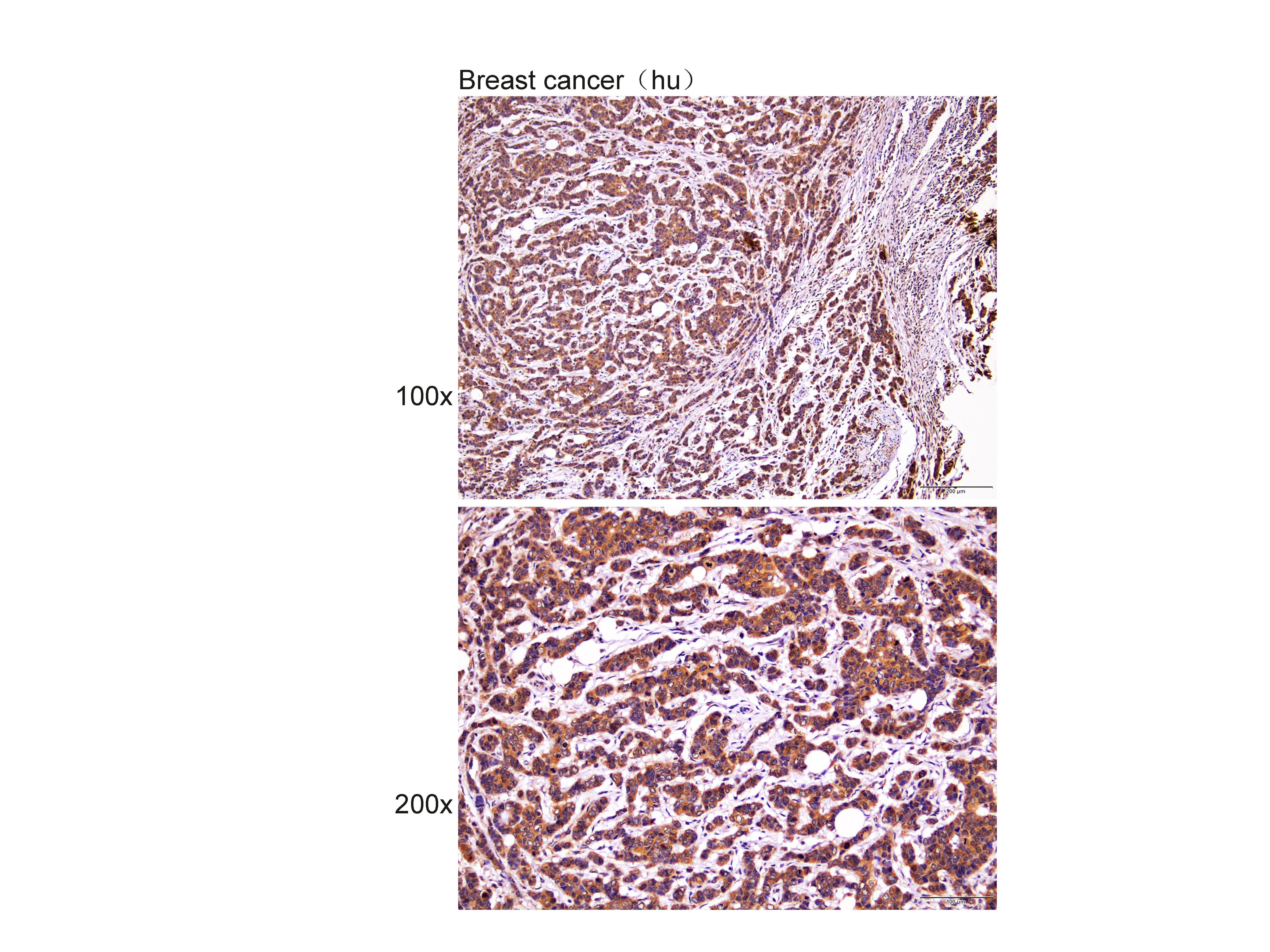 Immunohistochemistry of paraffin-embedded Breast cancer(hu) using PRLR at dilution of 1:50 (x100 lens,x200 lens).