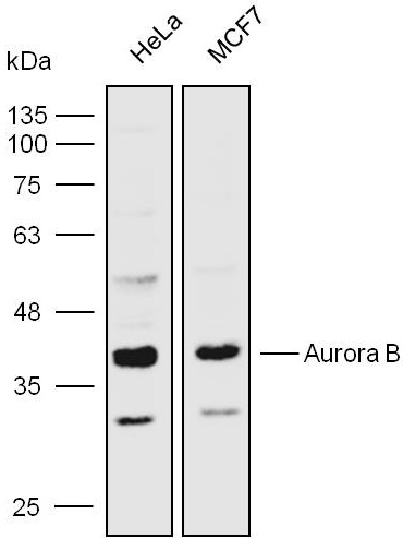 Western blot analysis with Aurora B antibody diluted at 1:12000;Lane: HeLa,MCF7.