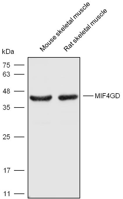 Western blot analysis with MIF4GD antibody diluted at 1:6000;Lane:Mouse skeletal muscle,Rat skeletal muscle