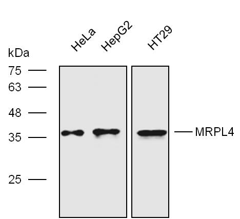 Western blot analysis with MRPL4 antibody diluted at 1:6000;Lane:HeLa,HepG2,HT29