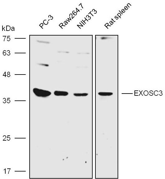 Western blot analysis with EXOSC3 antibody diluted at 1:6000;Lane:PC-3,Raw264.7,NIH3T3,Rat spleen