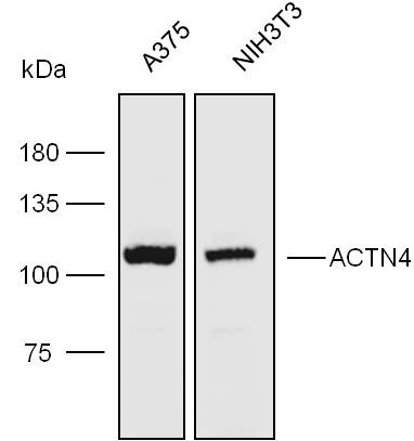 Western blot analysis with ACTN4 antibody diluted at 1:10000;Lane:A375,NIH3T3