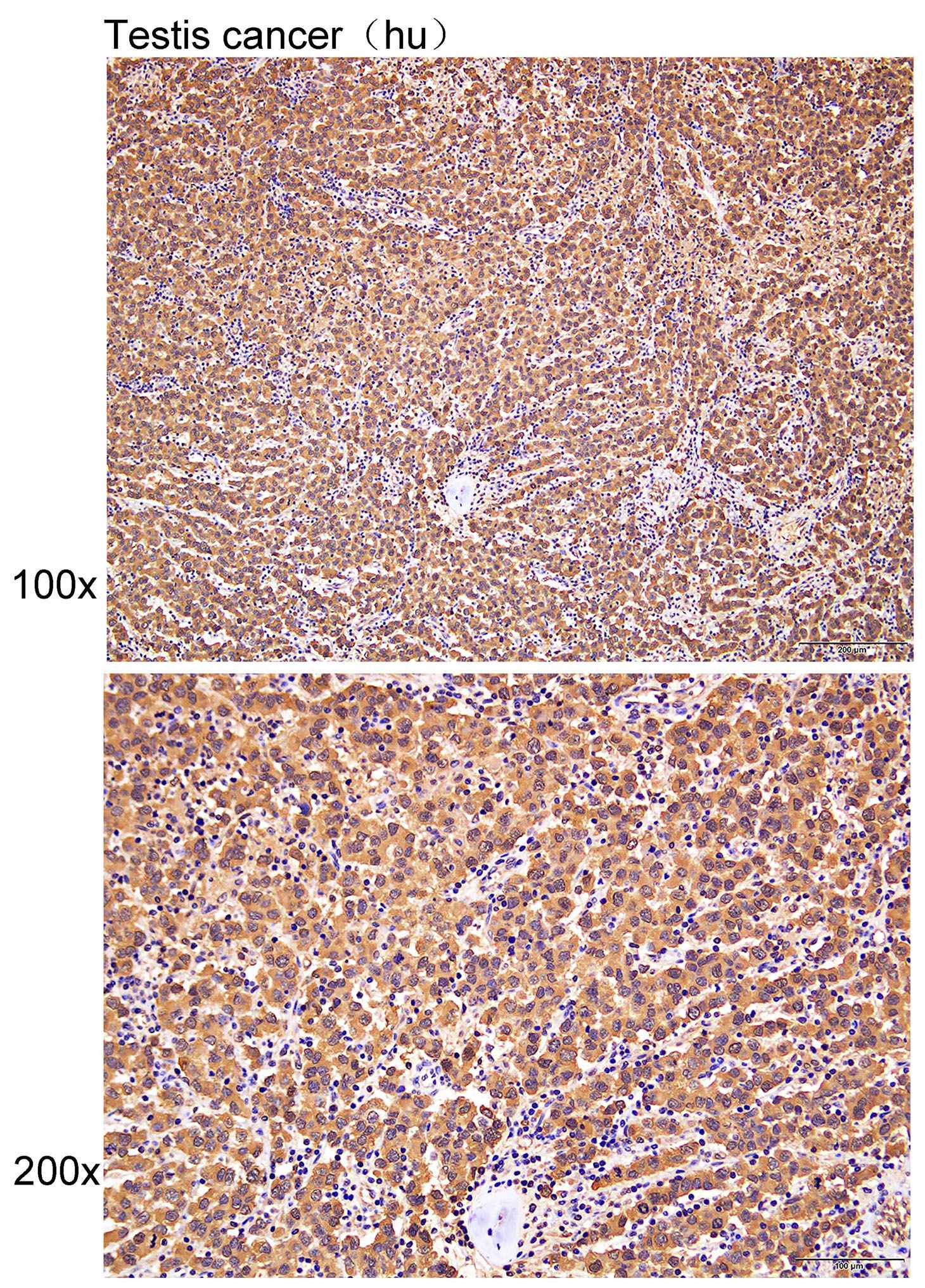 Immunohistochemistry of paraffin-embedded Human testis cancer with HSP90AA1 antibody diluted at 1:100