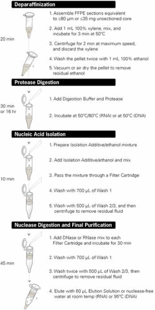 The RecoverAll™ Total Nucleic Acid Isolation Kit procedure requires about 45 minutes of hands-on time and can be completed in typically less than 1 day for RNA. FFPE samples are deparaffinized using a series of xylene and ethanol washes. Next, they are subjected to an extensive protease digestion with an incubation time tailored for the recovery of either RNA or DNA. Nucleic acids are then purified using a rapid glass-filter method, and are eluted into either water or low-salt buffer.
