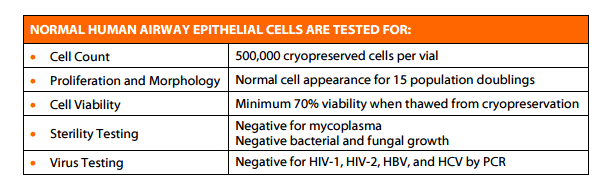 HBTEC are not exposed to antimicrobials or phenol red when cultured in BronchiaLife™ medium, an advantage since these supplements can cause cell stress and “masking effects” that may negatively impact experimental results.