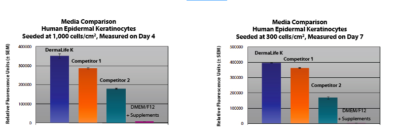 DermaLife K Serum-Free Medium grows Human Epidermal Keratinocytes and Oral Keratinocytes through at least 15 population doublings at rates that meet or exceed other commercially available serum-free media while maintaining excellent cell morphology. In comparisons with other commercially-available media, DermaLife K shows superior proliferation of epidermal keratinocytes at different seeding densities.