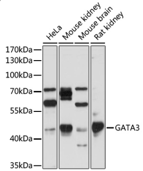 Western blot analysis with GATA3 antibody diluted at 1:1000;Lane:HeLa,Mouse kidney,Mouse brain,Rat kidney