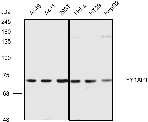 Western blot analysis with YY1AP1 antibody diluted at 1:2000;Lane:A549,A431,293T,Hela,HT29,HepG2
