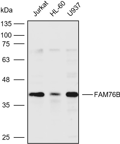 Western blot analysis with FAM76B antibody diluted at 1:2000;Lane:Jurkat,HL-60,U937