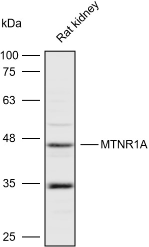 Western blot analysis with MTNR1A antibody diluted at 1:2000;Lane:Rat kidney