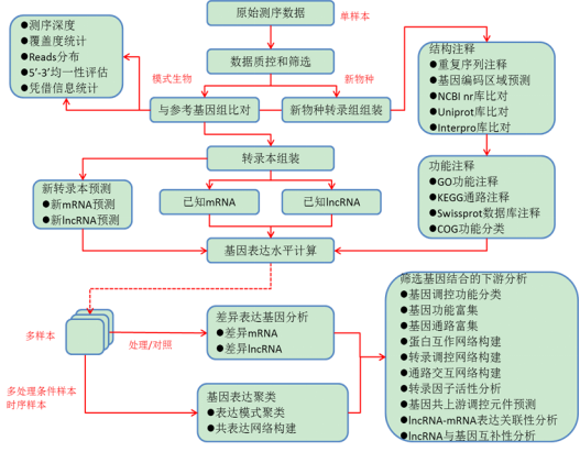 转录组测序的研究对象为特定细胞在某一功能状态下所能转录出来的所有RNA的总和,主要包括 mRNA和非编码RNA 。转录组研究是基因功能及结构研究的基础和出发点,通过新一代高通量测序,能够全面快速地获得某一物种特定组织或器官在某一状态下的几乎所有转录本序列信息,已广泛应用于基础研究、临床诊断和药物研发等领域。转录组是特定组织或细胞在某一发育阶段或功能状态下转录出来的所有RNA的总和,主要包括mRNA和非编码RNA(non-coding RNA,ncRNA)。转录组研究能够从整体水平研究基因功能以及基因结构,揭示特定的生物学过程,已广应用于植物候选基因发掘、功能鉴定及遗传改良等领域。随着新一代测序平台的市场化,RNA测序(RNA sequenclng,RNA-Seq)技术已成为了转录组学研究的重要手段之一。该技术利用新一代高通量测序平台对基因组cDNA测序,通过统计相关Reads(用于测序的cDNA小片段)数计算出不同mRNA的表达量,分析转录本的结构和表达水平,同时发现未知转录本和稀有转录本,精确地识别可变剪切位点以及编码序列单核苷酸多态性,提供最全面的转录组信息。转录组测序技术流程主要包括样品制备、文库构建、DNA成簇扩增、高通量测序和数据分析,相对于传统的芯片杂交平台,RNA-Seq技术具有诸多独特优势,转录组测序无需预先针对已知序列设计探针,即可对任意物种的整体转录活动进行检测,提供更精确的数字化信号、更高的检测通量以及更广泛的检测范围,是目前深入研究转录组的强大工具