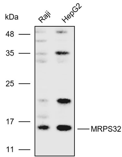 Western blot analysis with MRPS32 antibody diluted at 1:6000;Lane: Raji,HepG2