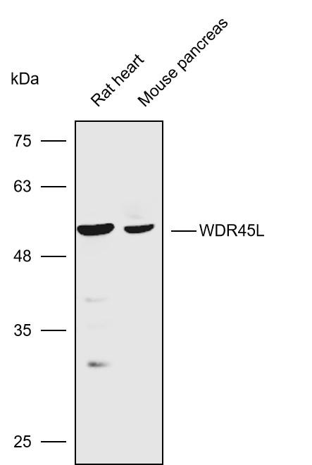Western blot analysis with WDR45L antibody diluted at 1:6000;Lane:Rat heat,Mouse pancreas