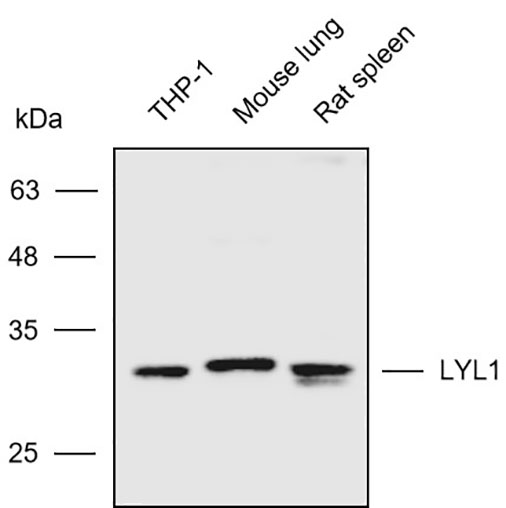 Western blot analysis with LYL1 antibody diluted at 1:6000;Lane: THP-1,Mouse lung,Rat spleen