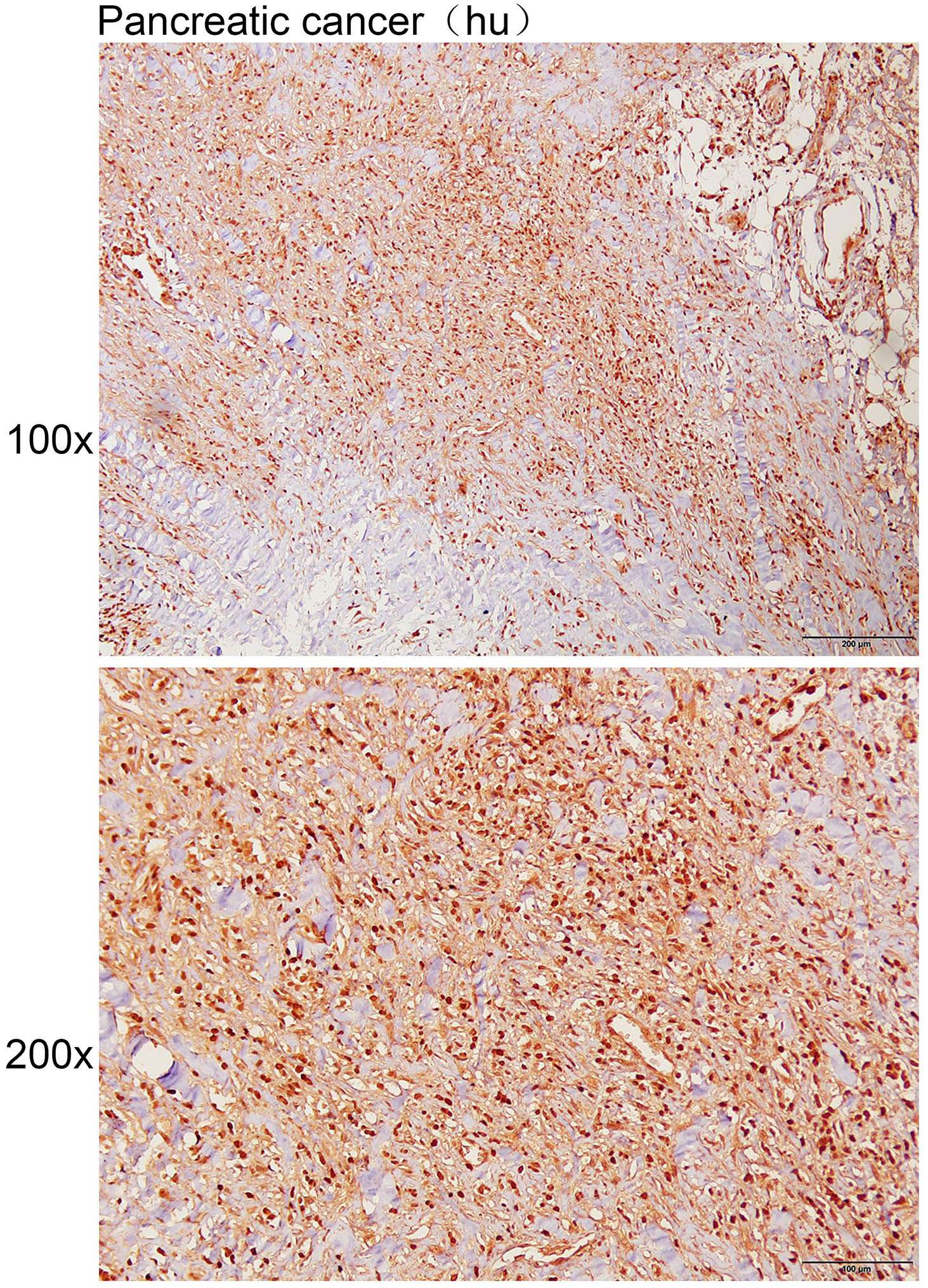Immunohistochemistry?of?paraffin-embedded Human pancreatic cancer with?DEK antibody diluted at 1:100