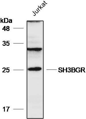 Western blot analysis with SH3BGR antibody diluted at 1:6000;Lane:Jurkat