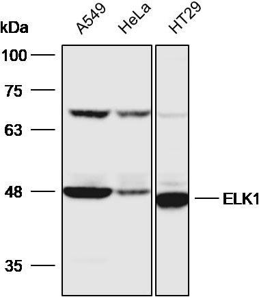 Western blot analysis with ELK1 antibody diluted at 1:2000;Lane: A549,HeLa,HT29