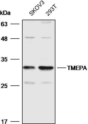 Western blot analysis with TMEPA antibody diluted at 1:2000;Lane: SKOV3,293T