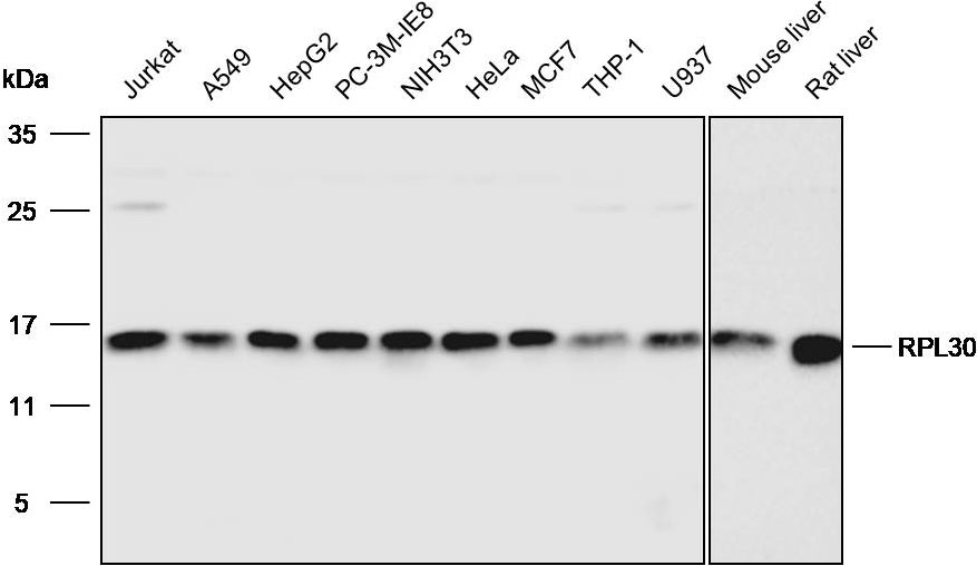 Western blot analysis with RPL30 antibody diluted at 1:2000;Lane:Jurkat,A549,HepG2,PC-3M,NIH3T3,HeLa,MCF7,THP-1,U937,Mouse liver,Rat liver