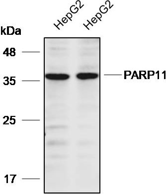 Western blot analysis with PARP11 antibody diluted at 1:2000;Lane: HepG2