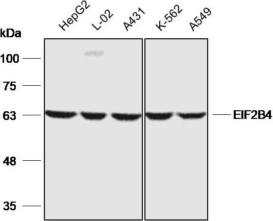 Western blot analysis with EIF2B4 antibody diluted at 1:2000;Lane: HepG2,L-02,A431 K-562,A549