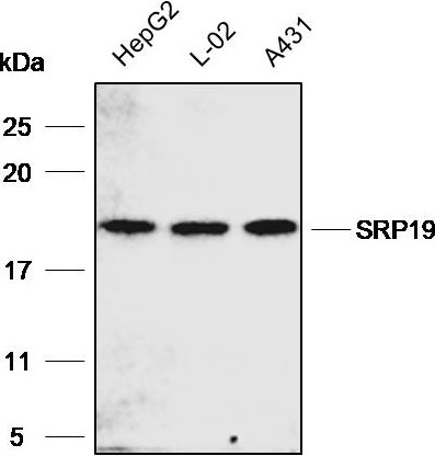 Western blot analysis with SRP19 antibody diluted at 1:2000;Lane: HepG2,L-02,A431