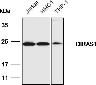 Western blot analysis with DIRAS1 antibody diluted at 1:2000;Lane: Jurkat,HMC1,THP-1