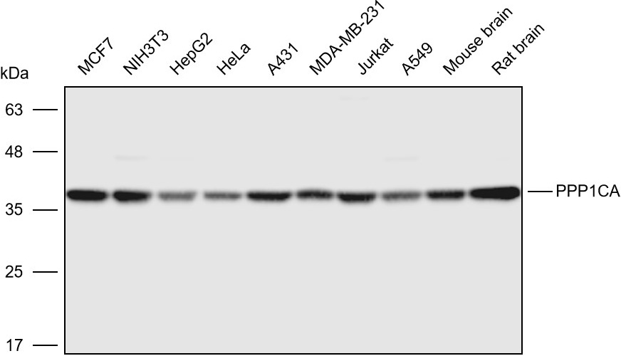 Western blot analysis with PPP1CA antibody diluted at 1:2000;Lane: MCF7,NIH3T3,HepG2,Hela,A431,MDA-MB-231,Jurkat,A549,Mouse brain,Rat brain