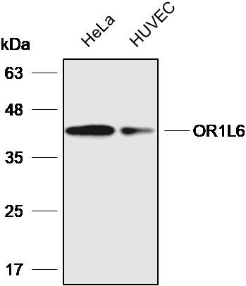 Western blot analysis with OR1L6 antibody diluted at 1:2000;Lane: Hela,HUVEC