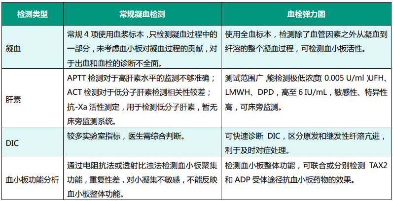 药物疗效监测中,有些研究将血栓弹力图与其他凝血功能检测方法进行比较,但结果却似乎有较大差异。比如 Coppell 曾报道过在监测肝素类药物疗效时,血栓弹力图普通测试的敏感性比其他传统凝血测试对低浓度的 UFH,LMWH 等要高,尤其是极低浓度时(0.005 U/mL)。在监测抗血小板药物疗效时,血栓弹力图系统比之其他血小板功能检测系统,如 PFA-100,Plateletworks,Veryfynow 等,各有优劣势,正如 C. Corredor 在综述中所描述的一样,根据单独的血小板功能检测模块来看,它们之前的线性关系似乎并不明显,而且,由于这方面的研究文献并不算多,导致结论并不统一,很难说哪个更好。不过,由于血栓弹力图的试剂组合方式多样,从凝血功能监测、输血管理、纤溶诊断方面评价的话,血栓弹力图仍然代表着目前凝血功能检测、抗凝药物疗效监测的最先进的方法之一。
